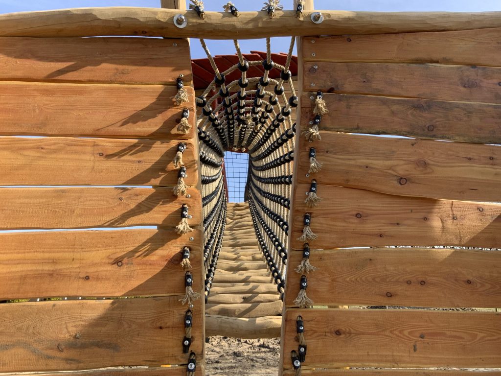 Die Konstruktion besteht aus einer erhöhten Turm- und Podestanlage mit geschwungenem Dach, verbunden durch zwei großzügige Klettertunnel aus Seilnetz. Verschiedene Balancieraufgänge und farbig gestaltete Kletterelemente laden zum Mitmachen ein – ganz gleich ob kleine Entdecker oder abenteuerlustige Erwachsene.